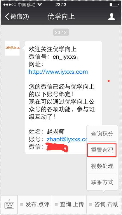 如已绑定微信,则可通过优学向上微信公众号重置密码,如图